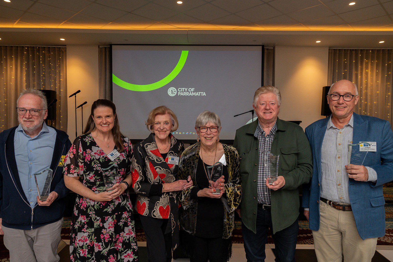 2024 Hall of Fame inductees Neil Litchfield, Caroline Reddel, Diane Crease, Andrew Davis and Tim Dennis, with ACT Patron Nancye Hayes.